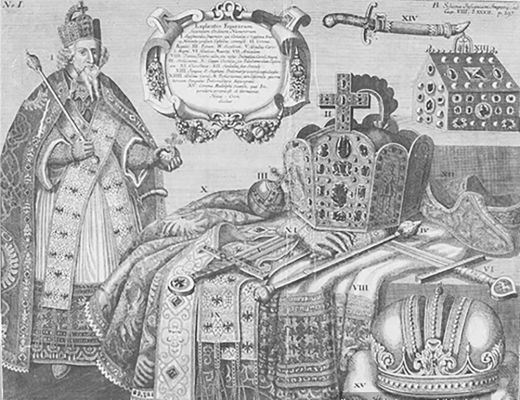 Zeichnung eines Kaisers mit Reichsinsignien © Bildarchiv der Bayerischen Staatsbibliothek